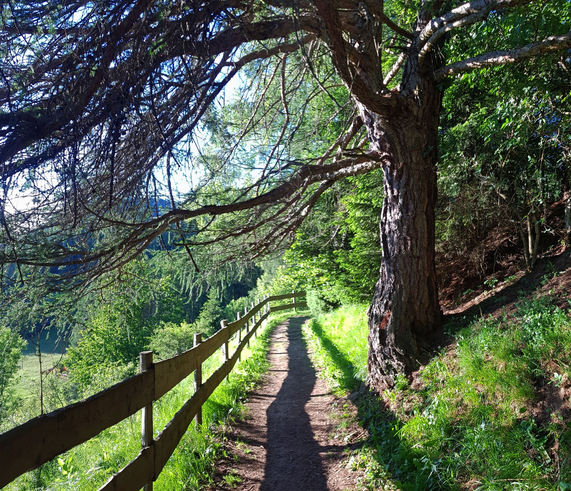 From the Coop grocery store go up along Via Libertà to the last house on the left. Here turn left onto "Via Vecchia for Veronza" and go up along the beautiful cobbled path. Cross the asphalted road, climb 50 meters and take the small path indicating "Calvello" which, through a grove of birch and larch trees, leads to a roundabout. Continue to the left for a few meters and, before "Maso Bortolotti", take the small road on the left with the indication "Sentiero dei Pini". Follow the small road that goes down through the pasture and, at the crossroads above the “Maso Toffa”, turn left onto the flat path until it crosses the paved road.