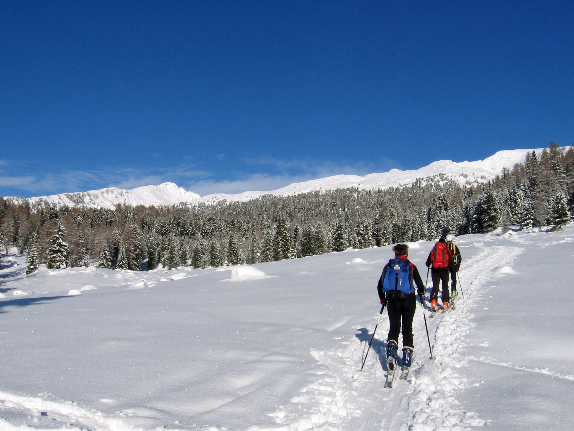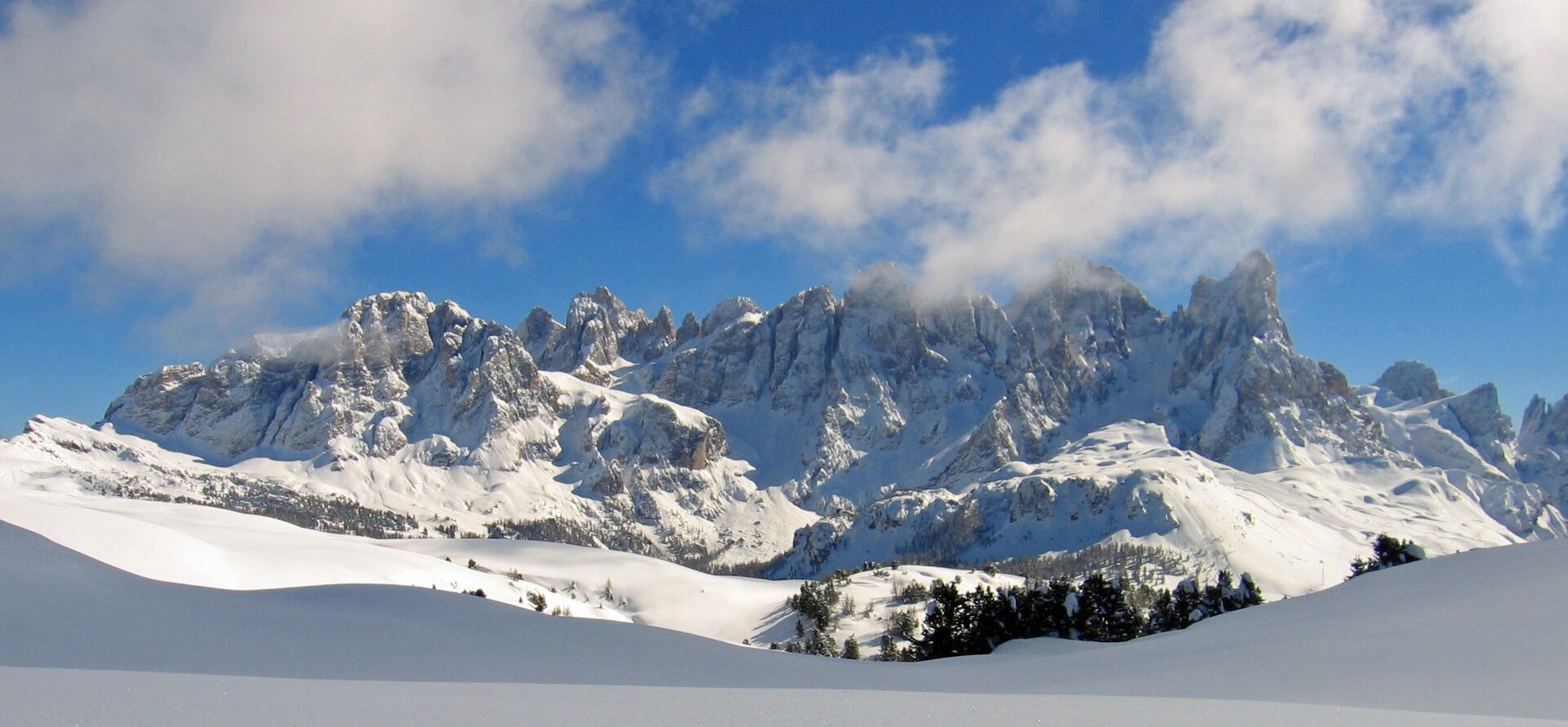 Departure into the lush Paneveggio forest, inside the Paneveggio - Pale di San Martino Nature Park. As you come out into the first clearing, you can see Malga Bocche (closed in winter) on the left, perched on a ridge. Continuing the ascent, the panorama of numerous Dolomite peaks begins to open up.