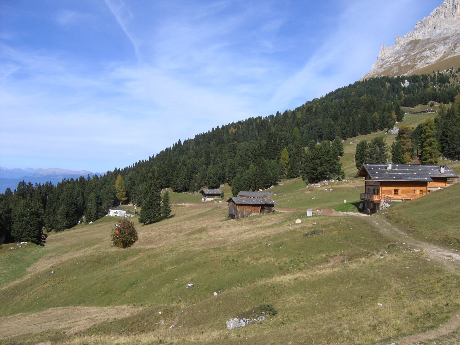 Walking through alpine meadows and wooden huts admiring the Latemar.