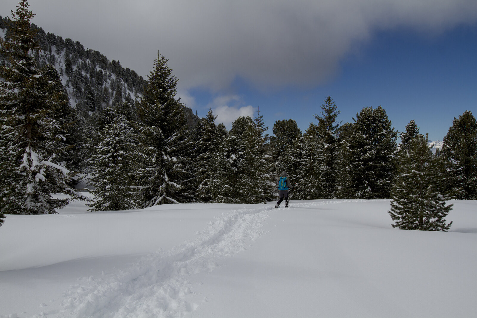 WAY UP Wear your snowshoes and leave the hotel Jochgrimm behind you, descending along the left side of the ski slope. At about 1900 m of altitude, on a tree on the left edge of the slope, you should be able to spot a sign pointing to path nr 4 to Malga Cugola. Follow the marks on the trees and after a while you will walk below a chairlift. Keep going through a wonderful wood of Swiss pines. The path continues through a gully and, after losing some altitude, reaches the Cugola Pass. From here slightly climb down on the other side (south), sometimes without snow, where you can find a stable on the right and Malga Cugola Alta on the left.