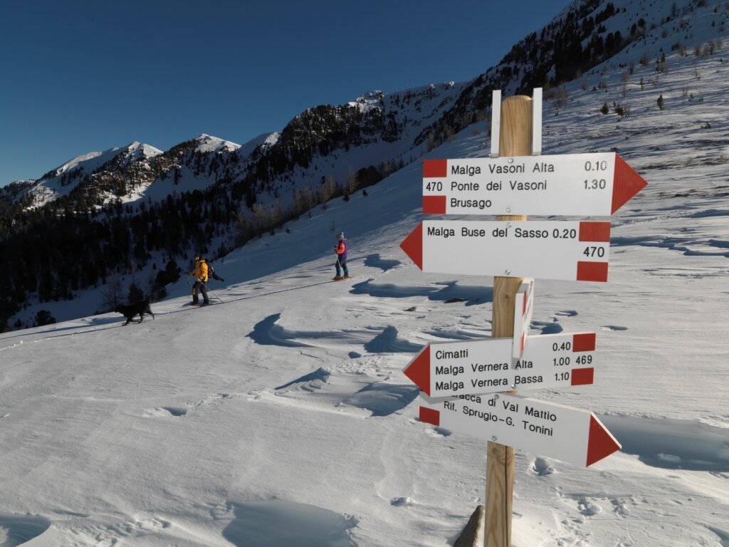 WAY UP Walk up on the forest road, sometimes covered with snow, that going south leads to the plain of Bait del Manz (1290 m). Crossed the bridge, keep walking south on the forest road in the wood with some ups and downs and several hairpin turns. Ignore on your right-hand the two tiny roads to Malga Vernera and on your left-hand the path to Malga del Coston. Go on to the main forest road, with steeper parts, until Malga Sass (alpine diary) (1970 m 2,5 hours walk), already a good achievement.