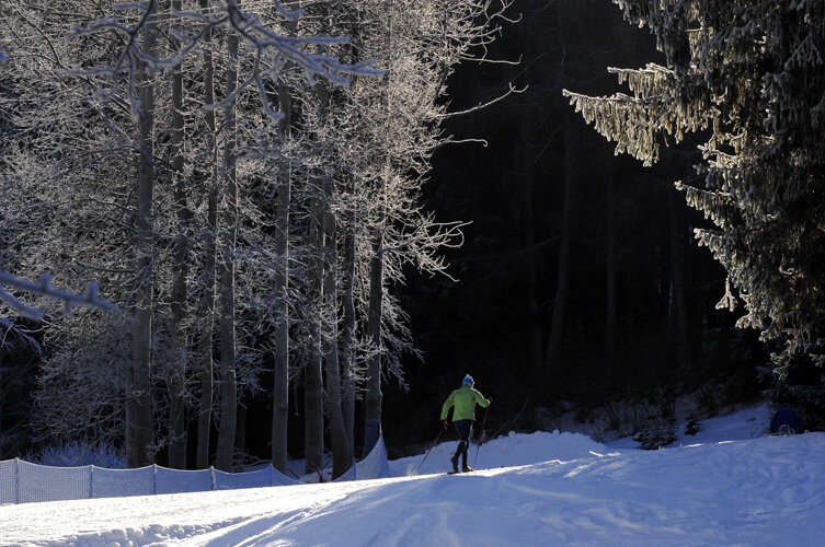 Leave the car in the large parking lot at Località Lido, in Molina di Fiemme. Gear up fully and start your skiing on the famous Marcialonga track. For long stretches, the trail runs alongside the Avisio, whose waters weave through stones and jagged ice sheets. A long row of willows covered in sparkling snow frames the stream and catches the eye between slides. Occasionally observing the surrounding natural beauty lightens the effort and nourishes both soul and body.