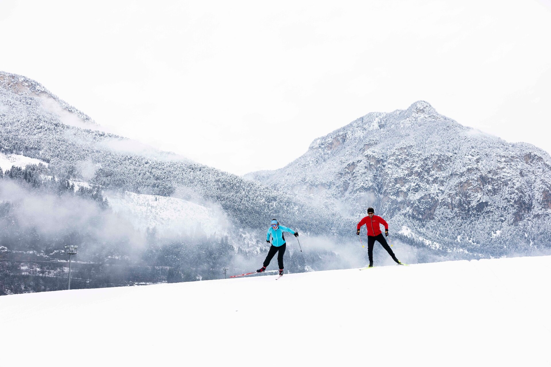 The Marcialonga di Fiemme and Fassa trail, a cross-country skiing race included in the prestigious Worldloppet circuit, crosses the entire valley floor alongside the Avisio Stream. Sliding on the course, your eyes glimpse the slow succession of all the villages of Val di Fiemme located on the slopes of the Cornon, the Pala di Santa, and the Corno Nero. Midway through, the trail crosses the Lago di Tesero Nordic Stadium, which has hosted the Nordic World Ski Championships three times and will be one of the “Host Sites” for the Milan-Cortina 2026 Winter Olympics.