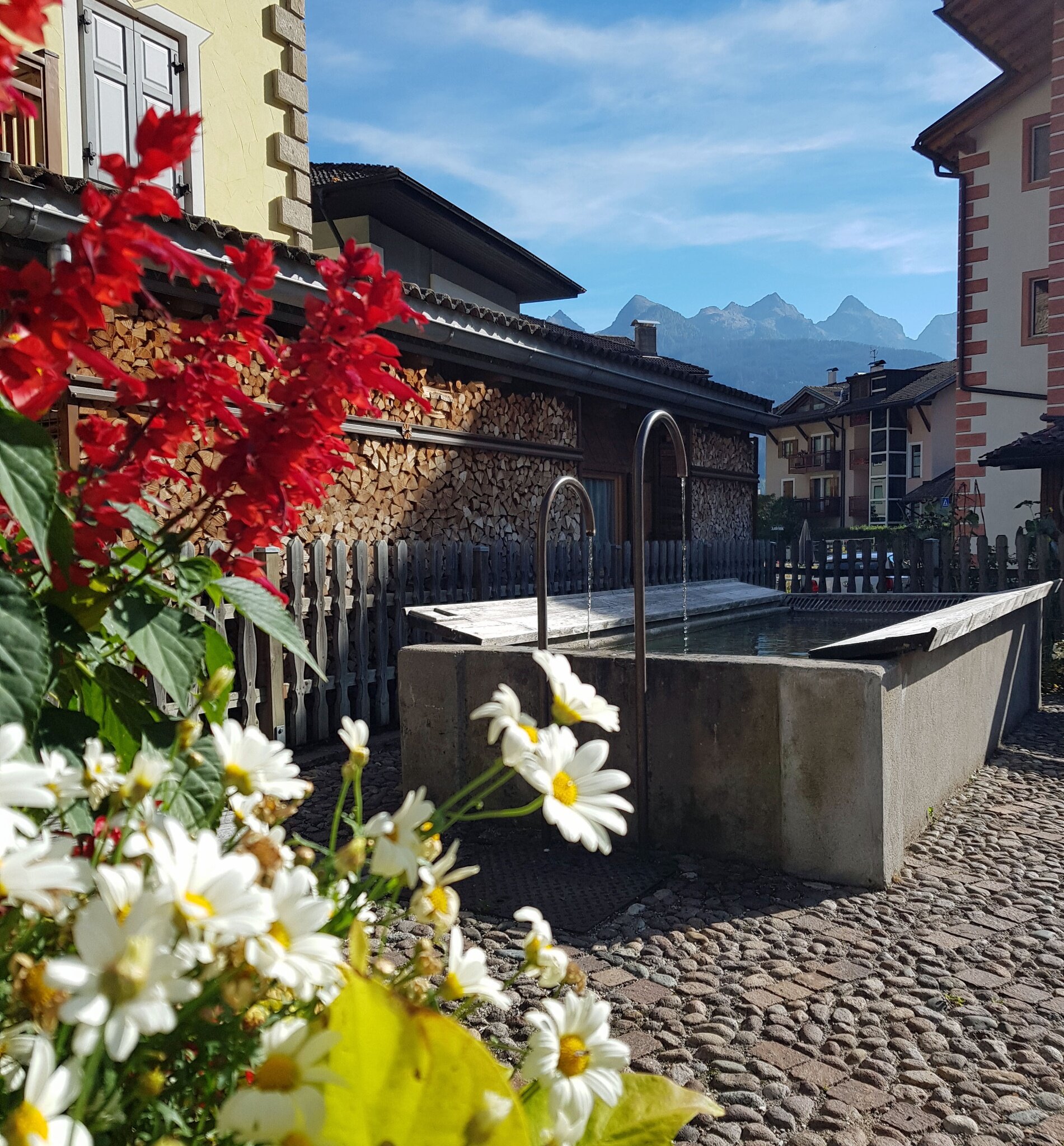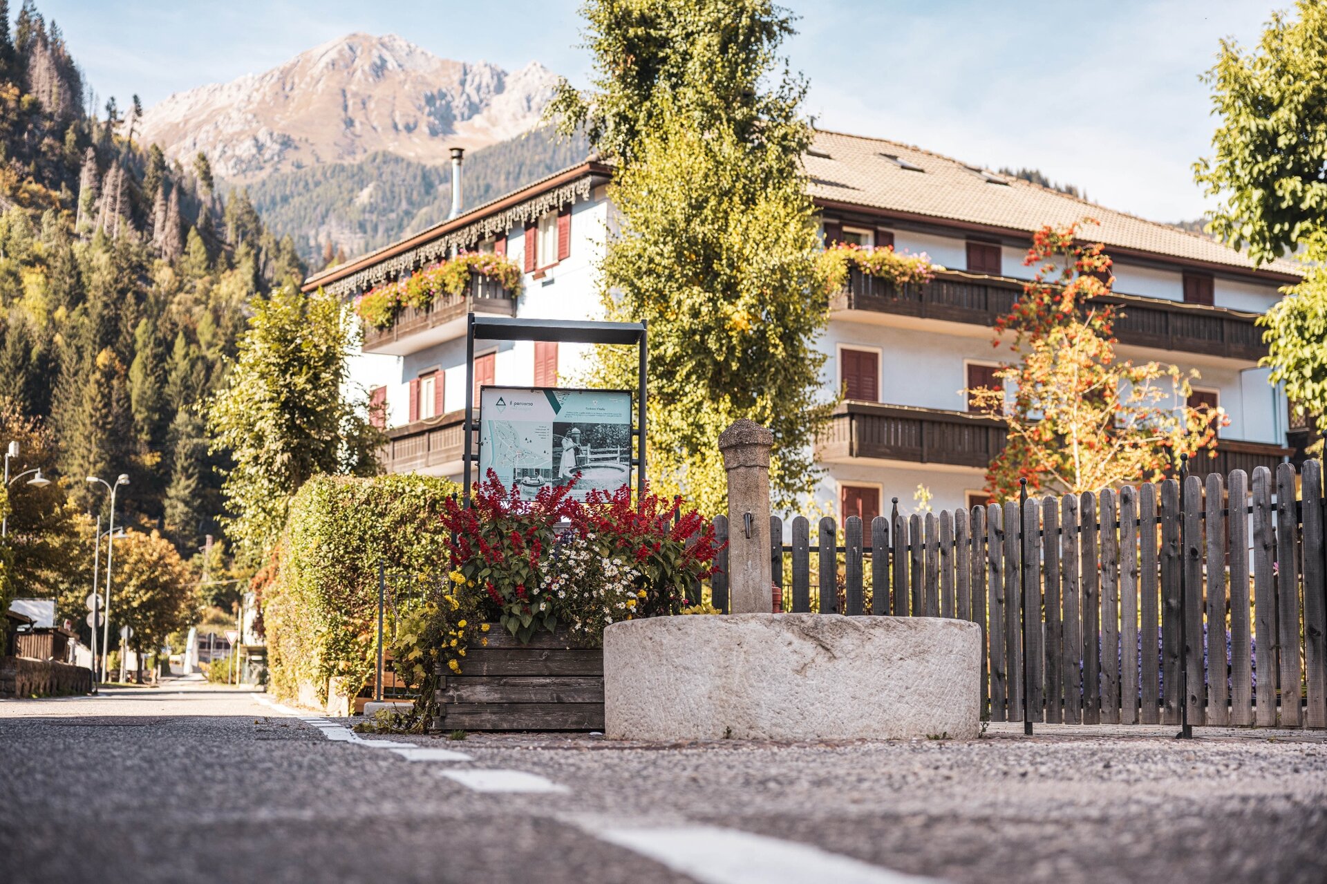 Once arrived at the crossroad with Via Bedovina, one can admire the new porphyry fountain on the left side, before walking uphill along the narrow road which heads to the “Al Prenner” fountain. Past the fountain, to the left, an ancient pedestrian passage skirts the building and descends back to Via Indipendenza. A few meters on the left, on the opposite side, a beautiful yellow house has got a narrow underpass which leads to Via Saronch and Via Mazzini: from here, turn right and walk to the fountains “Vinella” and “Sief”, then come back and turn into Via delle Rogge, which heads to a small square dominated by an old travai (a wooden head gate used to immobilize horses to shoe them) and by another historic fountain.
