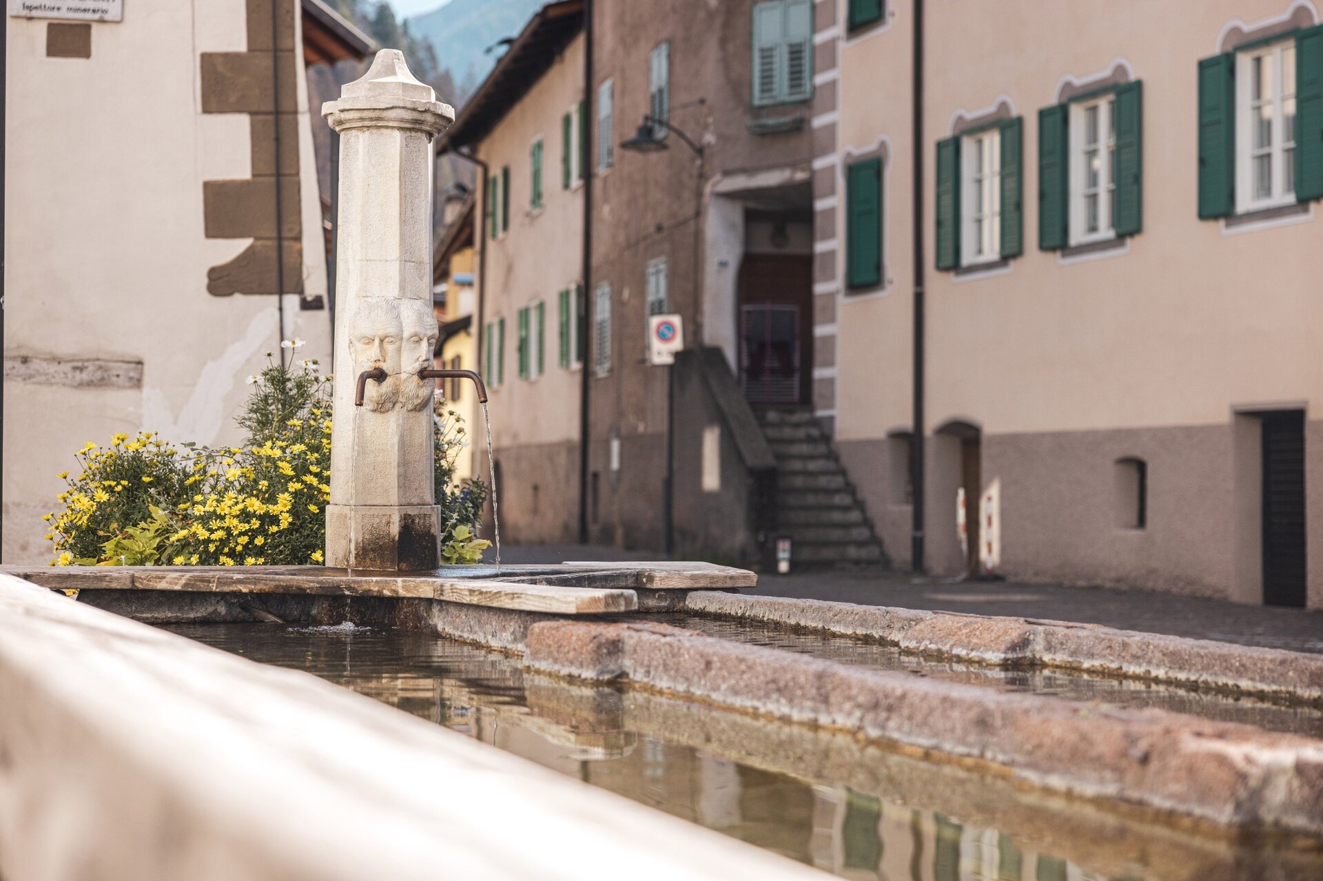 Walk down Via Minghetti up to the crossroad on the left with Via Vardabasso, where the fountain “Molìn” can be found; at the end of this short road, next to the library, a board with black and white pictures recalls the fountain of “Barancio”, the legendary bar of Predazzo in vogue in the sixties. Cross the road and walk up Via Cavour to the fountain “Pinzan”, the biggest one in Val di Fiemme, characterized by two carved faces, each of them with a spout that spills water. From there, walk back towards the main square on Via Garibaldi: the last fountain of the route is called “della Valghera” and the board next to it recalls some no longer existing fountains, which were used to do the laundry as well.