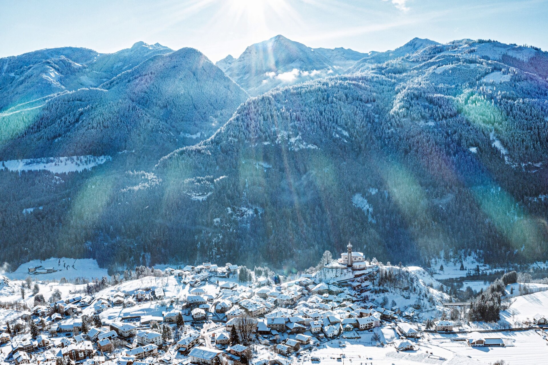 Its position on the promontory makes it clearly visible even from afar. Strange that a church was built right up there. In reality, a castle once stood on the hill above the inhabited area: it was built by Mainardo II, Count of Tirolo around 1276 and demolished in 1310. The village of Castello di Fiemme derives its name from that manor. The church of San Giorgio (now dedicated to the Immaculate Conception of Lourdes) is actually the small church on the left of the parish church. Both places of worship also stand out in the evening thanks to lighting that enhances their shapes and position.