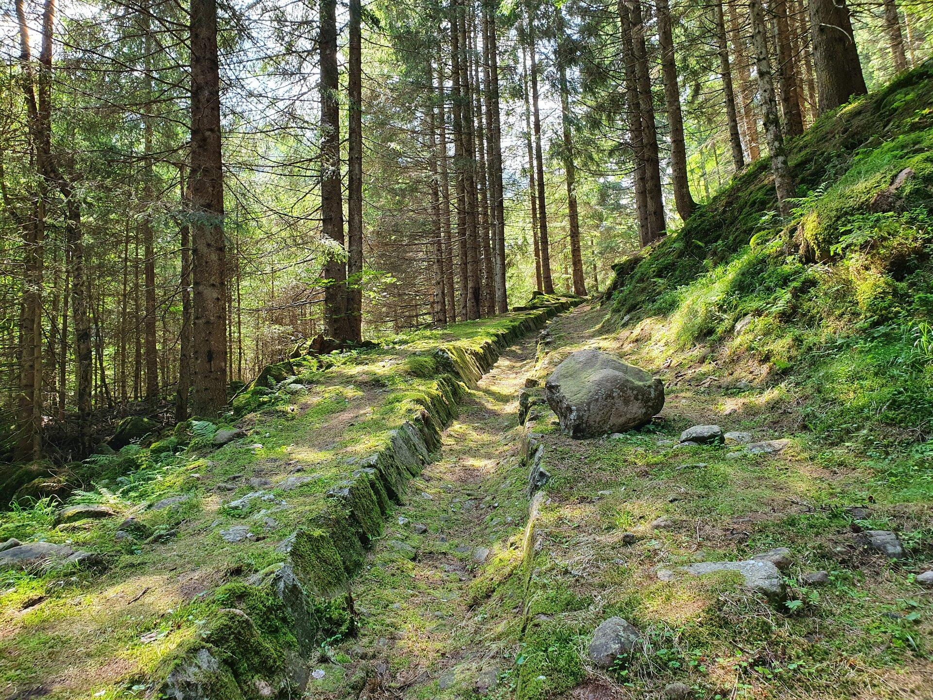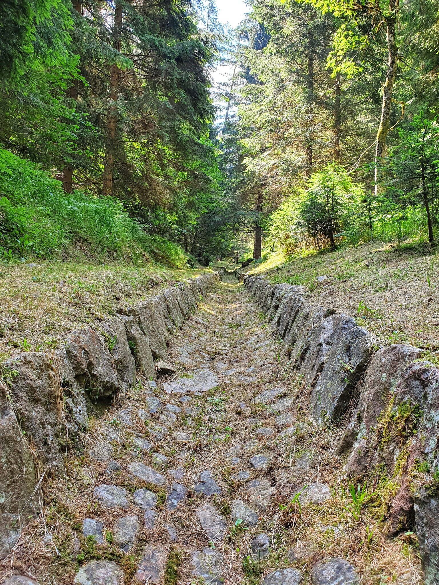 From Monte Alto it continues on a footpath through silent forests back in the direction of Valfloriana in an environment whose man-forest bond is an especially profound one. Beyond the majestic forests which dominate the landscape here, this is testified to by an imposing historic witness, Cava de le Bore, a historic channel paved in stone which woodsmen once used to get high altitude timber down into the valleys. It was extremely dangerous work but of crucial importance to this small mountain community. The Valfloriana Cava de le Bore was washed away by the 1966 flood but large scale renovation work by the town council means that this precious feat of mountain engineering can now once again be admired.