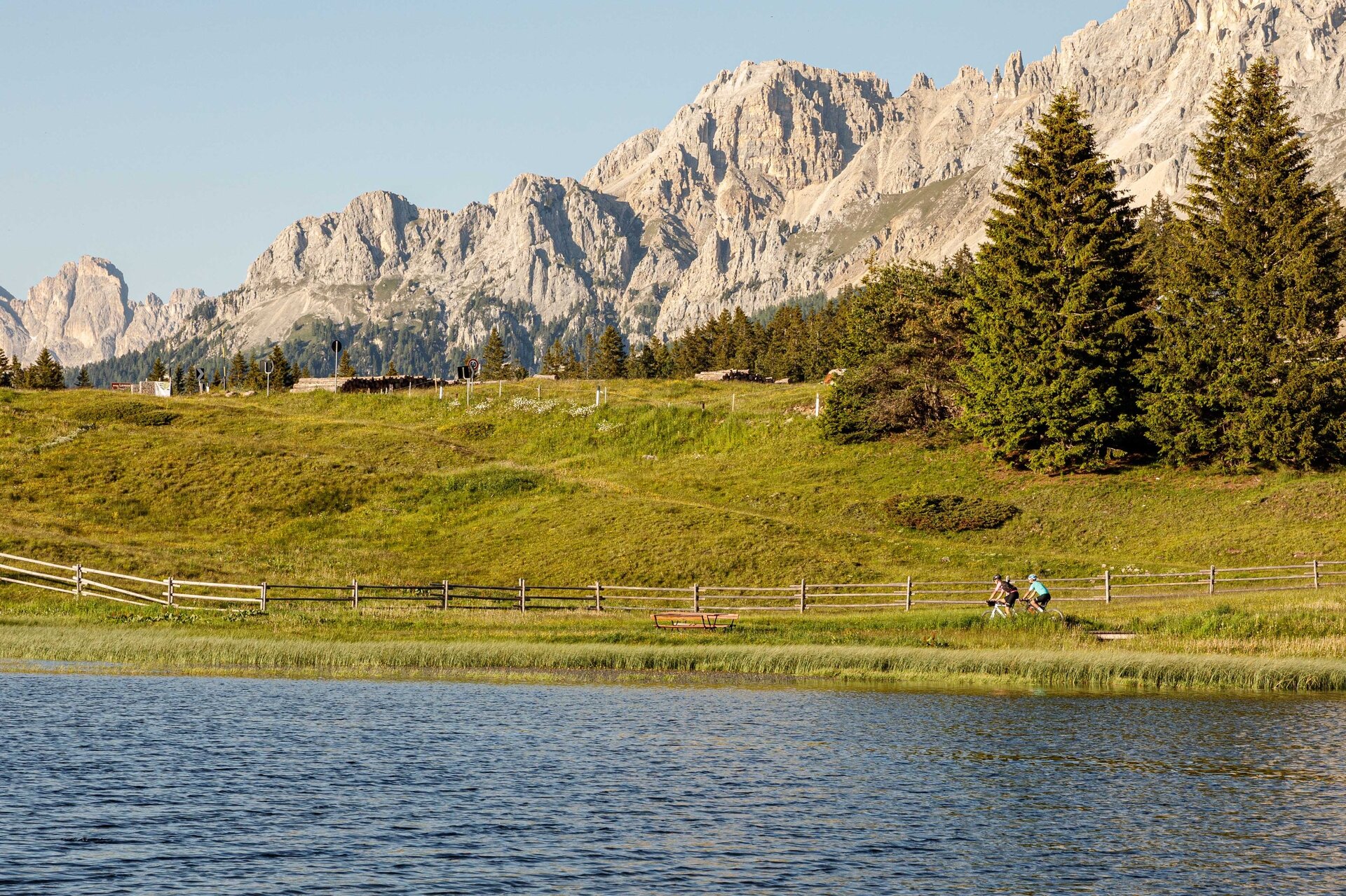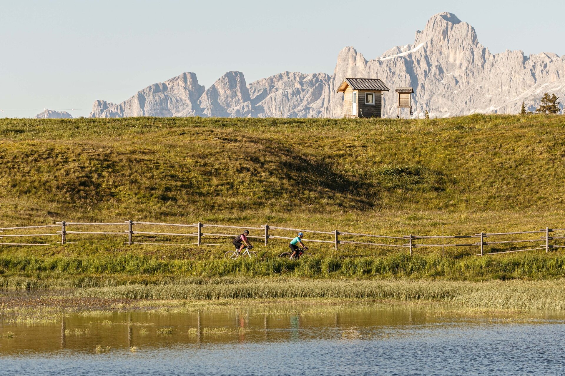 Die eindrucksvolle Tour führt durch die Weiden und Wälder des Lavazè-Plateaus und des Oclini Pass. Du fährst am Fuß des Corno Nero Gipfels, der aus porphyrischem Gestein besteht, und des Corno Bianco Gipfels, aus weißem Dolomitgestein. Die beiden Gipfel rahmen den Oclini Pass ein und begrüßen den Radfahrer mit ihren Farbkontrasten.