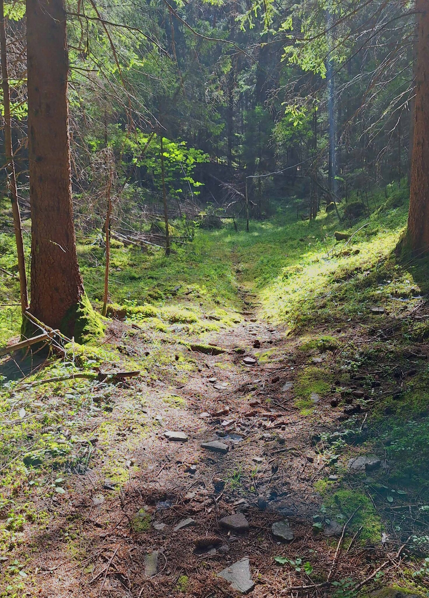 Sehr schattige Route, die sich in einem Wald aus Rotfichten entwickelt.
