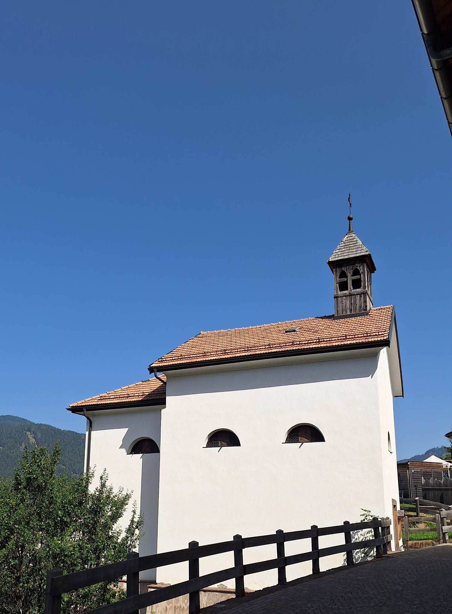 Ausgehend von der Kapelle von Dorà gehen wir die asphaltierte Straße bergauf und lassen sofort die letzten hübschen Häuser hinter uns. Blickt man nach rechts, sieht man die bewaldeten Hänge des Val di Cembra, das Dörfchen Grumes und die Paganella. Anschließend dringen wir in einen schönen Laubwald ein. An der Lichtung, wo oft Baumstämme gelagert sind, ignorieren wir die asphaltierte Straße bergauf, um den erkennbaren Fahrweg rechts zu nehmen. Wir folgen der Forststraße und ignorieren die erste steile Kreuzung rechts. Der Weg verläuft bergab bis zur zweiten Kreuzung, die den Wendepunkt markiert. Bevor wir umkehren, gehen wir bis zum kleinen Bach und atmen den Duft des feuchten Waldes ein. Wir kehren um und nehmen den erkennbaren Pfad links, der neben einer Mauer zu den Gehegen für Pferde und Alpakas führt. Der Weg durchquert schließlich das kleine Dorf Dorà, wo wir einige alte Häuser aus Porphirsteinen, einen kleinen Brunnen und ein Fresko am linken Haus in der Nähe der Kapelle bemerken.