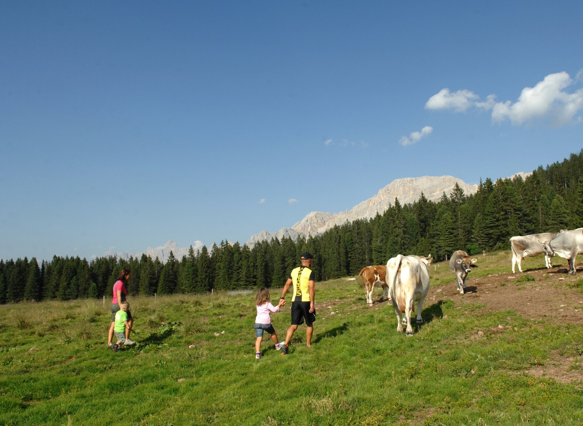 Gäste, die lieber ein Picknick machen möchten, können sich an einem der vielen verfügbaren Sitzplätze niederlassen, jeder mit einer lustig bunt gemusterten Unterlage. Neben der Malga Costa (Liegalm) befindet sich ein Stall, in dem viele Kühe wohnen, die tagsüber angenehme Gesellschaft bieten.