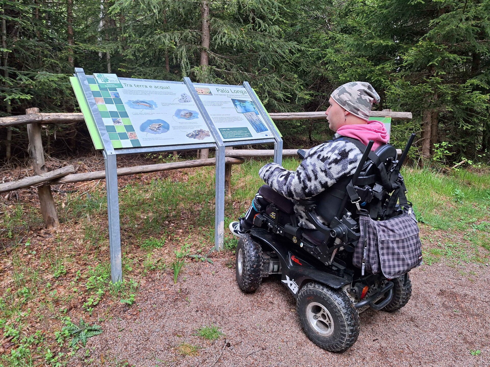 Vom Parkplatz aus ist bereits der erste Anstieg sichtbar (maximale Steigung 18 %), nach dessen Ende man links einen kleinen Bach sieht. Danach folgt der zweite Anstieg (maximale Steigung 16 %), der länger ist als der vorherige. Der Bodenbelag ist unbefestigt, aber fest, und der 4x4-Kinderwagen fährt problemlos. Nach dem flachen Abschnitt sieht man nach einem kurzen Stück links einen kleinen mit Kies bedeckten Pfad, der zu den Ufern des Teichs des Biotop Palù Longa führt. Hier gibt es einen kleinen Steg (nicht für Kinderwagen zugänglich), aber der Teich und die Seerosen sind auch vom Ufer aus sichtbar.