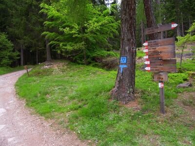 Ausgehend von Prà del Manz steigt die Route zu den Pradi hinauf und führt bequem auf dem Weg Nr. 1 hinein. In der Ortschaft Peschiera biegt man links auf eine schöne, überwiegend ebene Forststraße ab und trifft auf viele bemerkenswerte Bäume, darunter eine prächtige monumentale Weißtanne. Nach links abwärts auf dem Weg Nr. 2 geht es dann auf bequemer Forststraße zurück zum alten und spektakulären Lärchenwald der Pradi und schließlich zurück zum Prà del Manz.