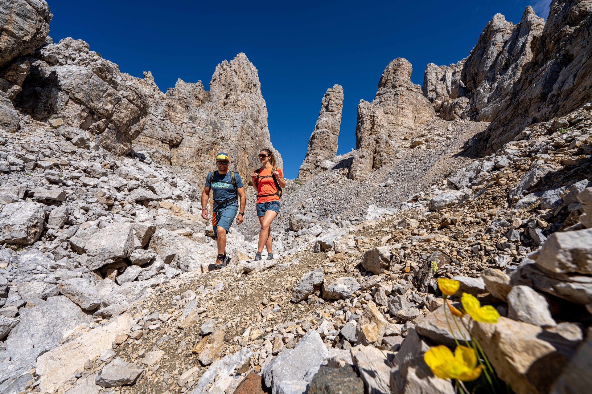 Rundwanderung zwischen den spektakulären Dolomitenwänden des Latemar-Massivs. Die Route ist nach den geneigten Felsentürmen benannt, die denen des toskanischen Städtchens ähneln. Die Strecke ist mittel/schwierig, der Abschnitt von der Forcella dei Camosci ist anspruchsvoll. Der Abstieg zur Oberholz-Hütte ist ziemlich steil, Trekkingstöcke werden empfohlen.