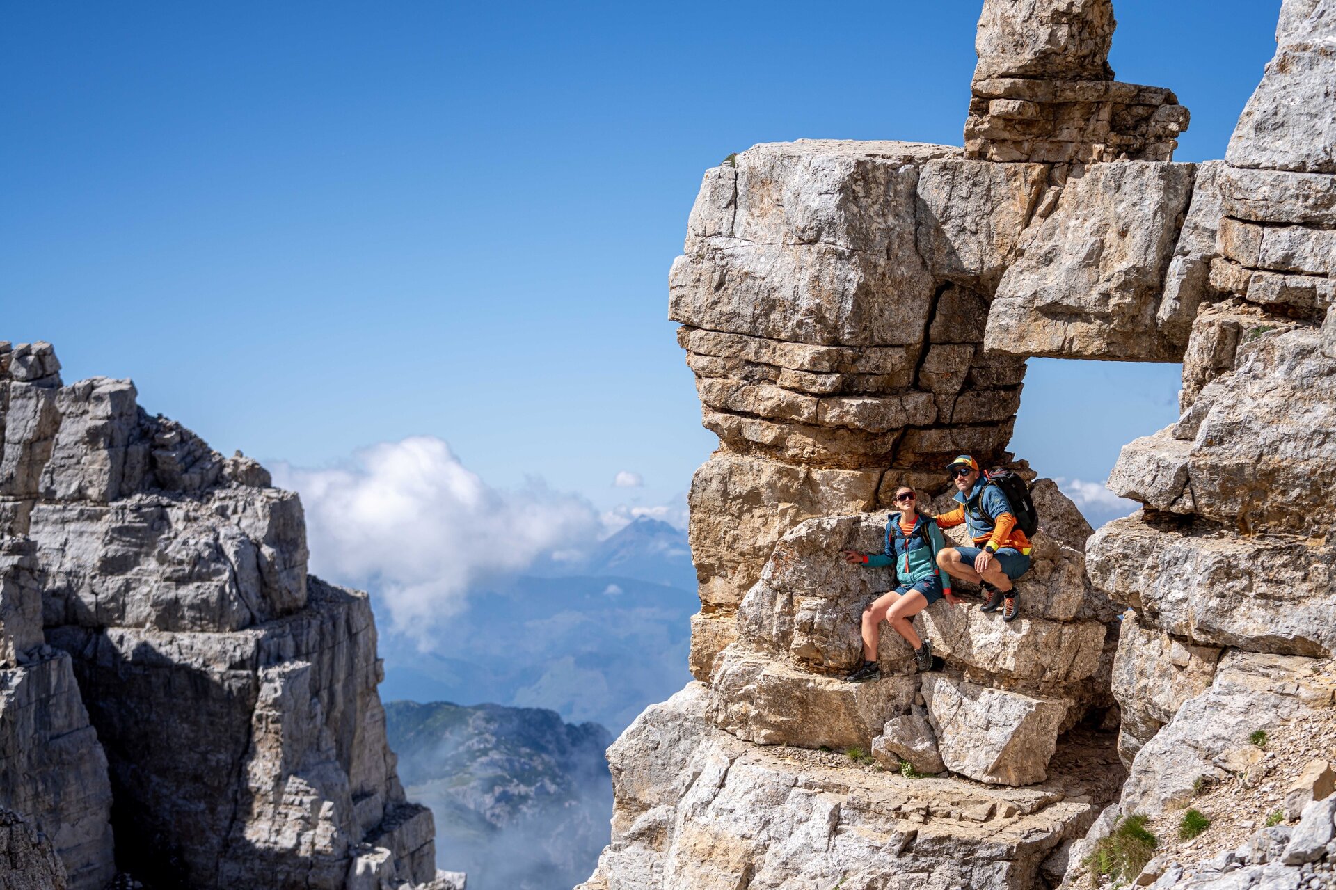 Vom Passo Feudo folge dem Weg Nr. 516 zum Rifugio Torre di Pisa. Gleich hinter der Hütte und noch auf dem Weg Nr. 516 sieht man links die Torre di Pisa, einen riesigen Felsvorsprung, der wie der berühmte Turm mit demselben Namen lehnt.