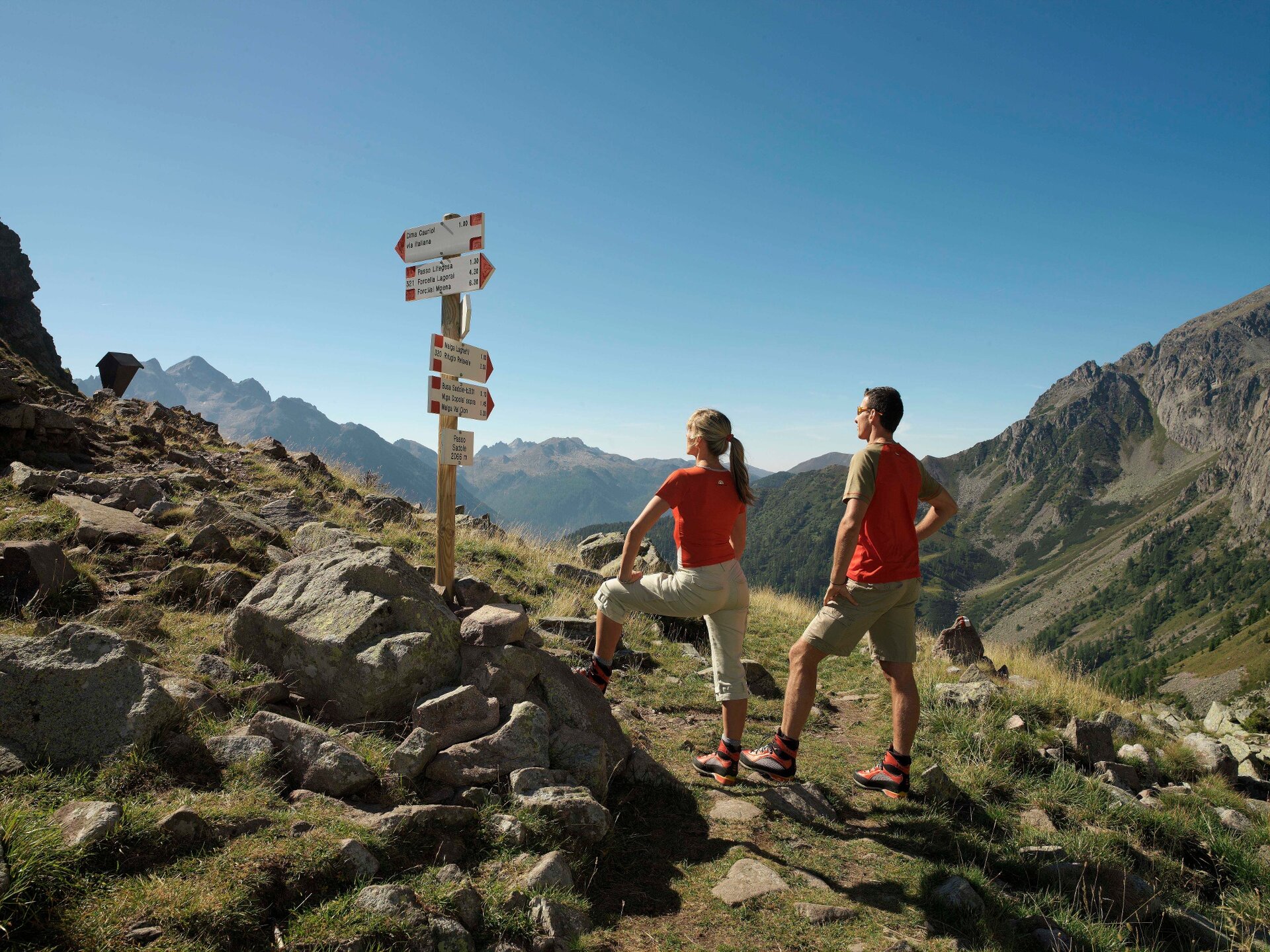 Start Forcella Lagorai (2.372 m): auf Weg n° 321 bis Forcella delle Sute (2.520 m), dann weiter Richtung Forcella di Coppola (2.533 m). Den Litegosa Gipfel (2.548 m) erreicht man dem Kamm entlang wandernd, dann geht man abwärts und kommt zum Litegosa Pass (2.261 m). Der Pfad n° 321 führt weiter am Fuße des Felsens „Pilastro del Frate“ und man erreicht den Sadole Pass (2.066 m). Von hier auf Pfad n° 320 geht man hinunter bis zur Berghütte Cauriol (1.600 m). Hier gibt es die Möglichkeit das Zelt im Gebiet „Pian delle Maddalene“ aufzuschlagen oder gemütlicher in der bewirtschaftete Berghütte Cauriol Tel +39 348 2422737 oder Tel +39 0462 836002 zu übernachten.