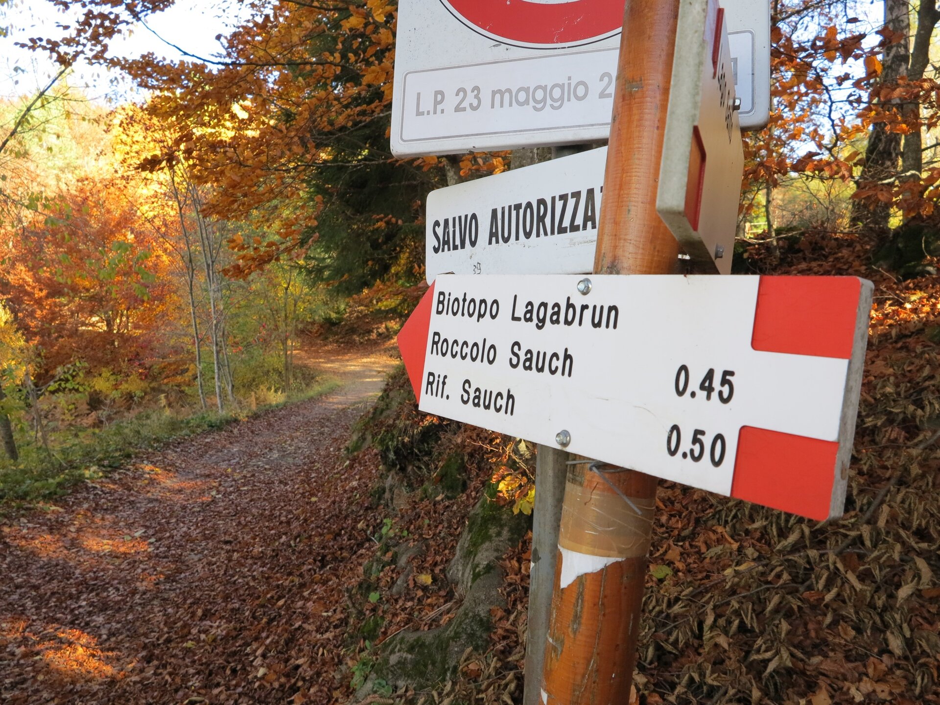 Ca. 50 Meter vor dem Parkplatz, gut sichtbar, beginnt der Forstweg, von dem aus die Route beginnt (weiss-blaues Schild für die Sauchhütte, Autoverbotsschild und weiß-rote Schilder)