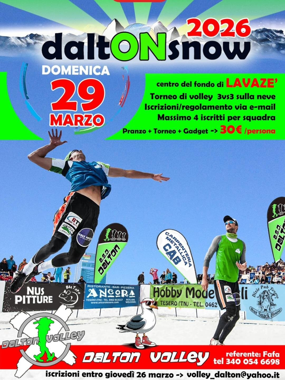 Am Sonntag, den 29. März, findet im Lavazè das 8. daltONSnow statt, das 3vs3 Volleyballturnier im Schnee.