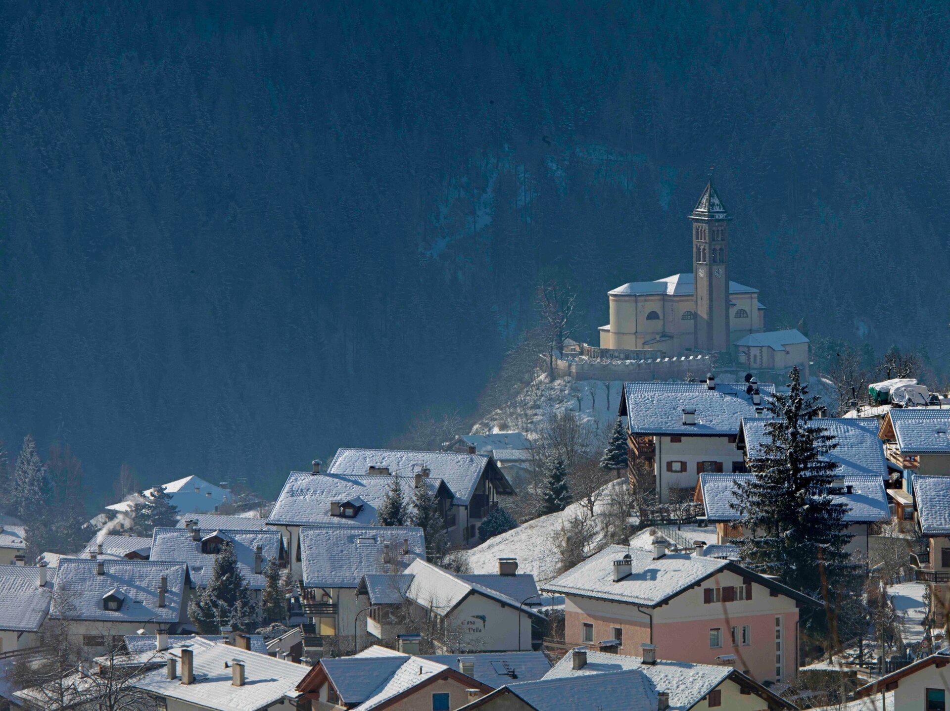 The destination of the walk is visible from the start, near the soccer field of Cavalese. Walk along the sidewalk in the obvious direction and at the intersection take the road to the left slightly downhill leading to a small bridge. After it the road becomes narrower, climbing gently through the meadows. You continue to walk reaching the first houses of the village of Castello di Fiemme. Upon reaching Los Andes hotel, take Via Fiemme on the left, which leads to Via Roma. From here, take the Via Salita alla Parrocchia on the left which, with a short but intense climb, leads to the 2 places of worship. From this natural balcony the view sweeps over several villages of Val di Fiemme and the surrounding mountains.