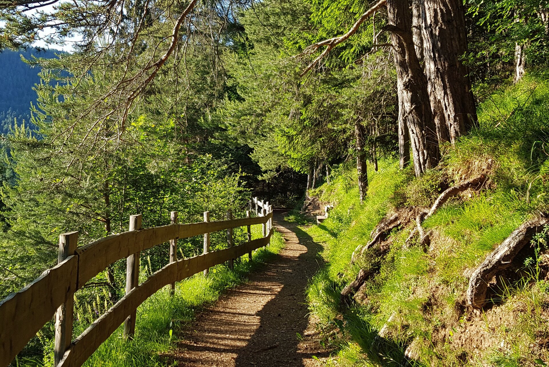 From the Coop grocery store go up along Via Libertà to the last house on the left. Here turn left onto "Via Vecchia for Veronza" and go up along the beautiful cobbled path. Cross the asphalted road, climb 50 meters and take the small path indicating "Calvello" which, through a grove of birch and larch trees, leads to a roundabout. Continue to the left for a few meters and, before "Maso Bortolotti", take the small road on the left with the indication "Sentiero dei Pini". Follow the small road that goes down through the pasture and, at the crossroads above the “Maso Toffa”, turn left onto the flat path until it crosses the paved road.