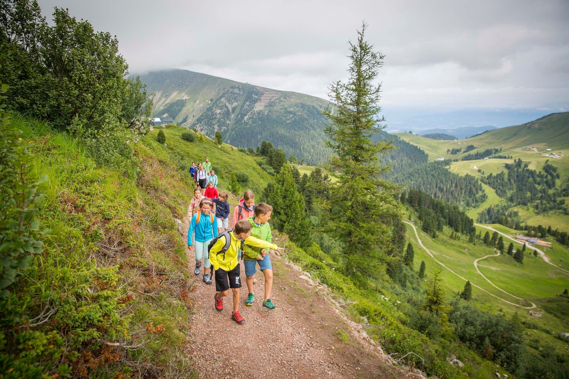 From Pampeago, ascend with the Agnello chairlift (check opening and schedules at www.latemar.it) and take the left fork on the path towards Rifugio In.Treska. Along this route, you can hear the sound of hail and thunder, or discover guided by the marmot Marmottix how an avalanche forms. The route continues left along path no. 515 which crosses a section of the Geotrail Dos Capèl, where once there were seas, shells, and atolls. Reaching Passo Feudo, continue up to the homonymous refuge, located at an excellent panoramic point. This last stretch of ascent can be avoided by taking path no. 504 to the left.