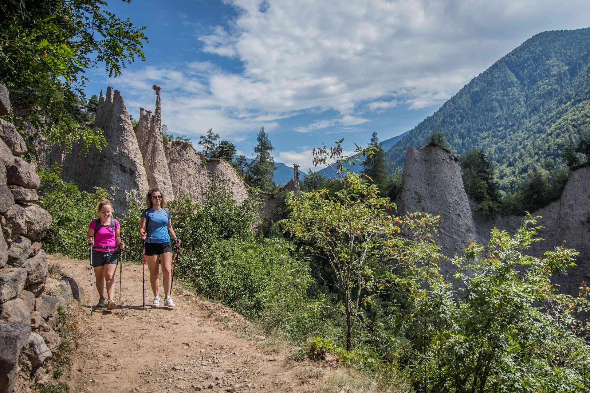 From here it is possible to return towards Faver or, taking the E5 again, climb up to the hamlet of Stedro where the Giacomozzi inn and distillery is located. From here, proceed gently uphill to the vantage point looking down on the Piramidi di Terra di Segonzano and descend along the path, which crosses the entire site, until reaching near the Regnana stream and the Chiosco alle Piramidi kiosk. A path leads back to the village of Piazzo from where you descend along the provincial road to the Friendship Bridge over the Avisio river. After crossing the bridge, turn immediately left along a secondary road that runs alongside the stream. Along the country roads that cross the vineyards, you climb up to Faver.