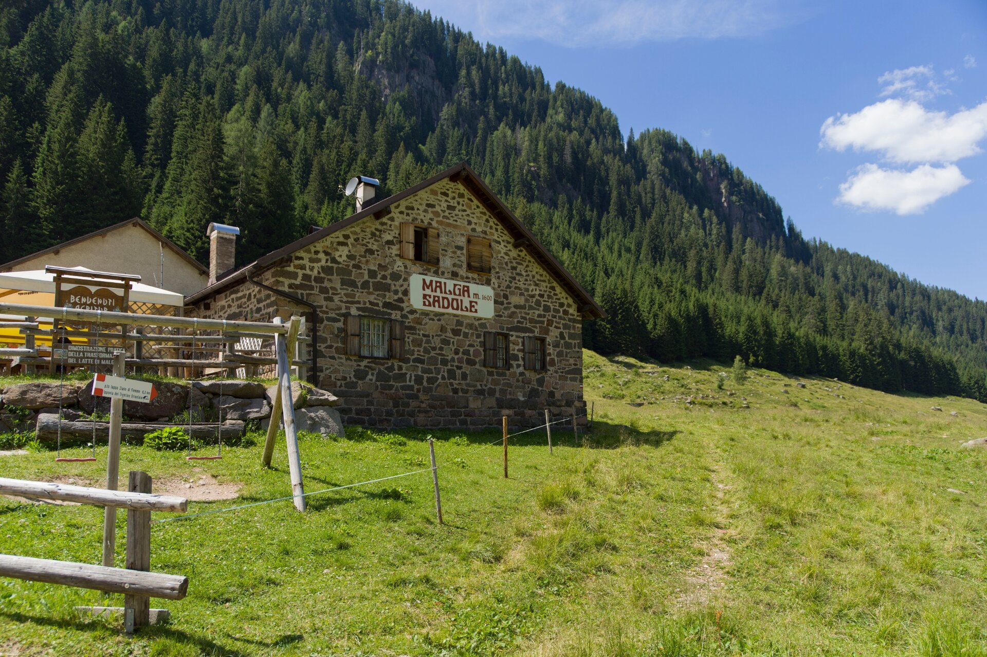 Also suitable for E-MTB. Although the technical level required is not very high, the altitude difference still requires good physical fitness. E-bike charging station at Malga Sadole.