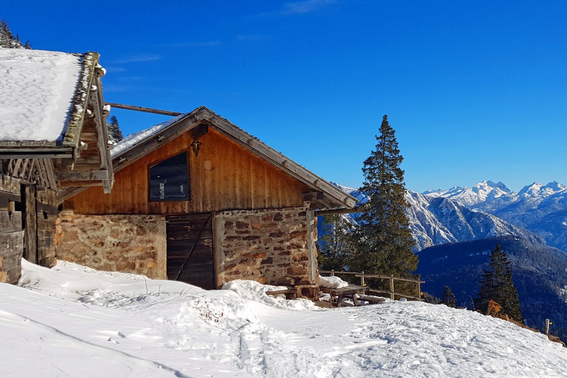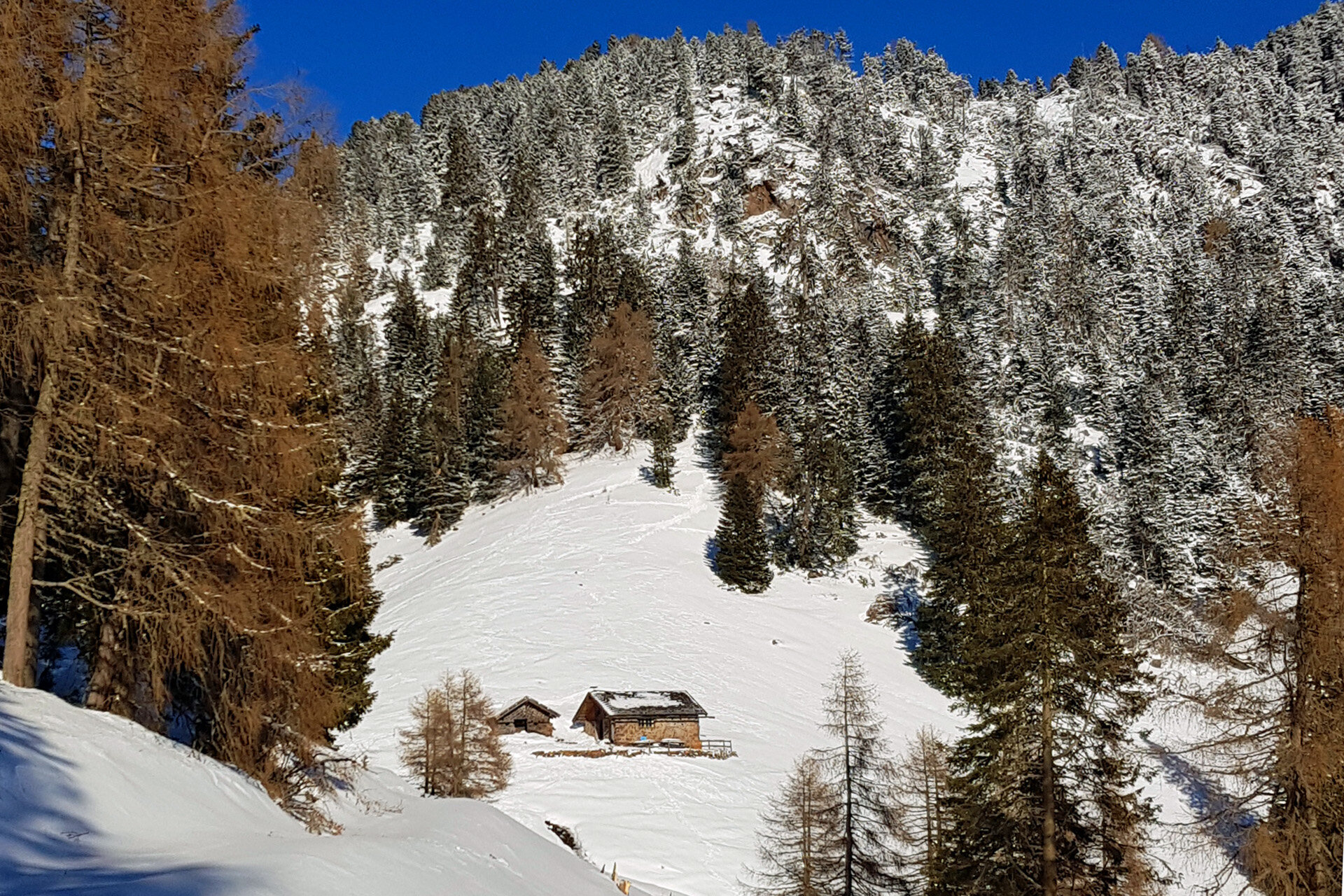 LA SALITA Indossa le tue ciaspole e lascia l'hotel Jochgrimm, scendendo lungo il lato sinistro della pista da sci. A circa 1900 m di altitudine, su un albero sul bordo sinistro della pista, dovresti vedere un cartello che indica il sentiero n. 4 per Malga Cugola. Segui i segni sugli alberi e dopo un po' passerai sotto una seggiovia. Prosegui attraverso un meraviglioso bosco di pini cembri. Il sentiero continua attraverso un canalone e, dopo aver perso un po' di altitudine, raggiunge il Passo Cugola. Da qui scendi leggermente dall'altro lato (a sud), a volte senza neve, dove troverai una stalla a destra e Malga Cugola Alta a sinistra.