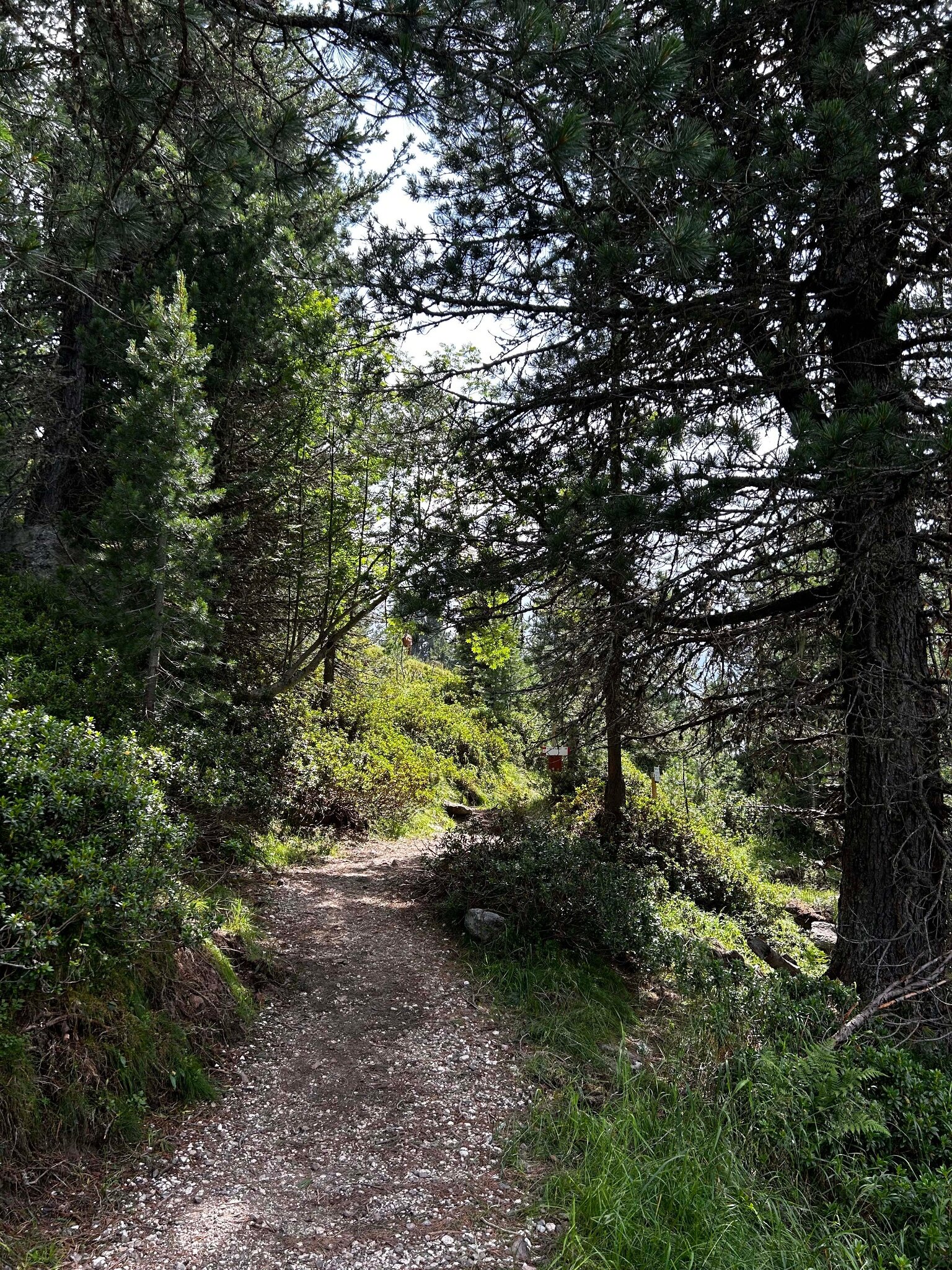 Raggiungi un'altitudine di 2000 m utilizzando le funivie di Alpe Cermis (impianti aperti da metà giugno a metà settembre) e dirigiti verso lo Sporting Hotel. Sulla sinistra, prendi il sentiero che si immerge nel misterioso e curioso bosco di pini cembri e sale con pendenza moderata fino al rifugio Lo Chalet.