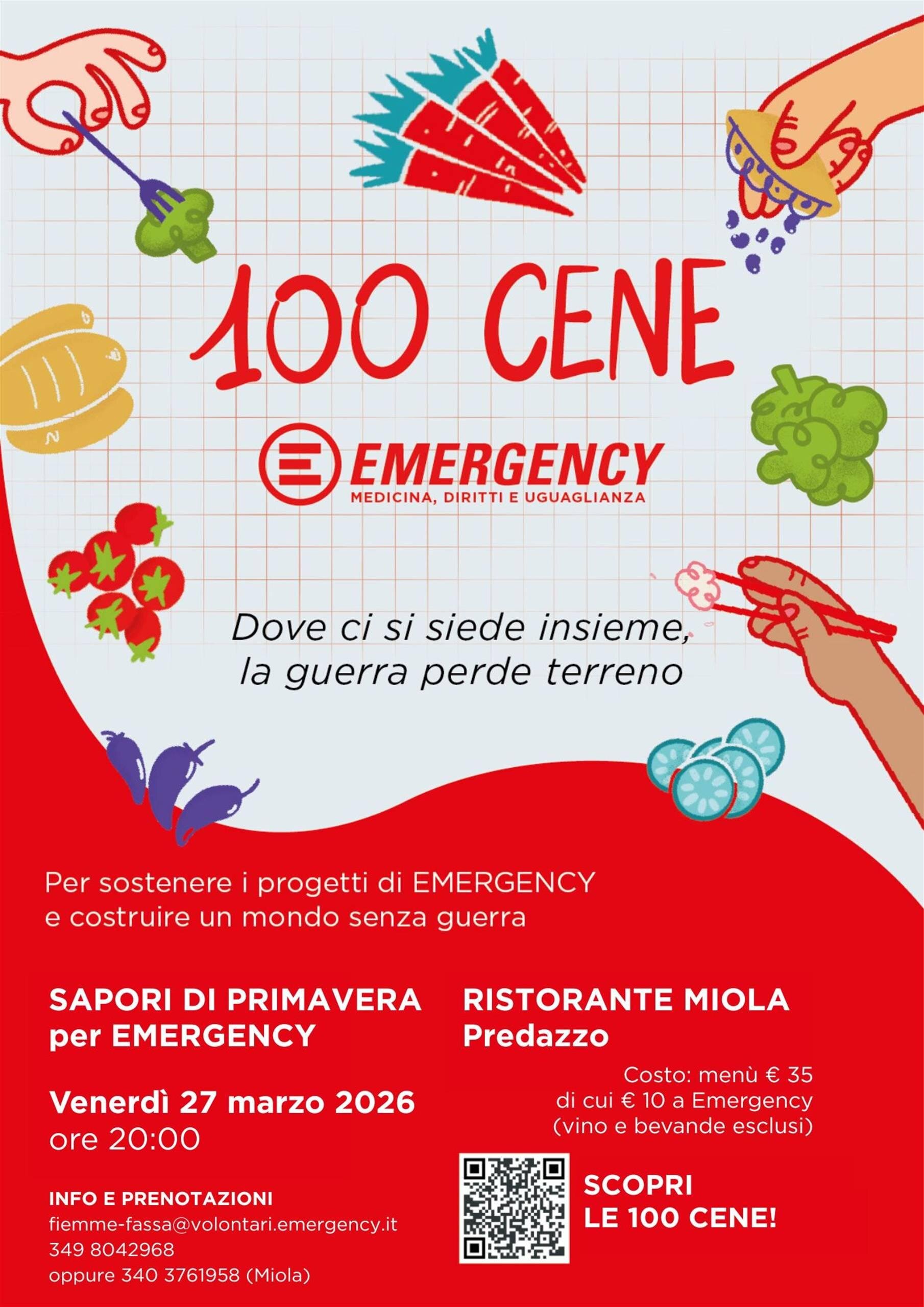 Prenotazione obbligatoria, presso il Ristorante Miola (340 3761958) oppure tramite i volontari del Gruppo Fiemme e Fassa (349 8042968 - fiemme-fassa@volontari.emergency.it)