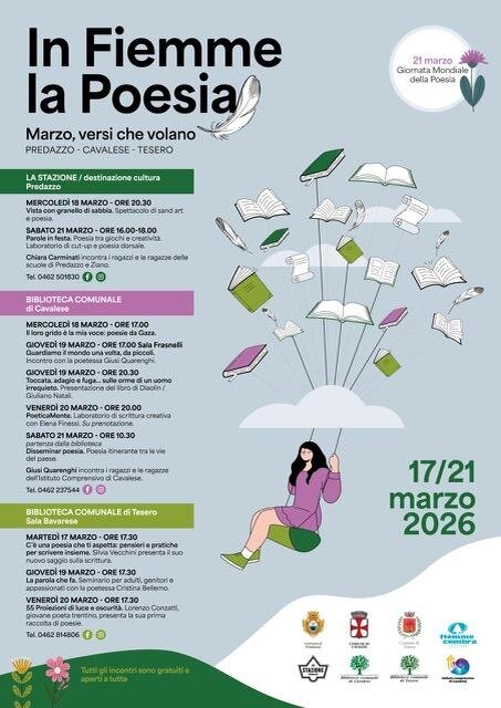 Questo appuntamento fa parte di un ciclo di incontri, in occasione del primo Festival della Poesia nella nostra Val di Fiemme. Questa iniziativa è nata dalla sinergia delle Biblioteche comunali di Predazzo, Cavalese e Tesero per dare valore alla Giornata Mondiale della Poesia, istituita dall’UNESCO per il 21 di marzo.