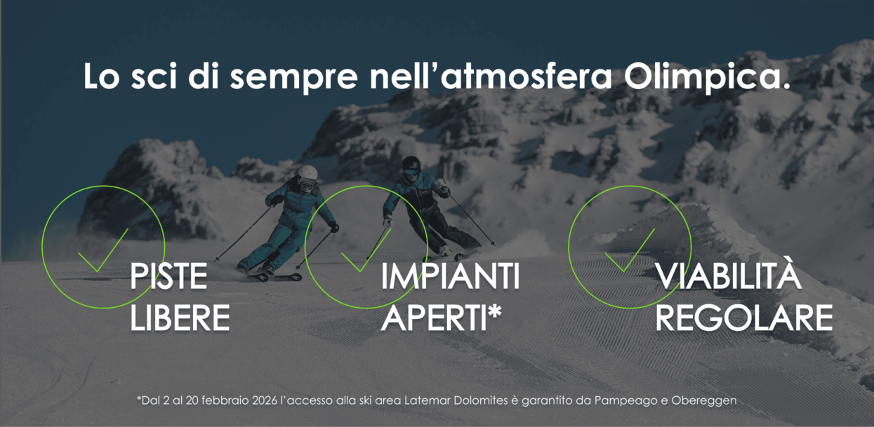 Per tutta la stagione invernale piste e rifugi saranno aperti e facilmente raggiungibili. Dal 2 al 20 febbraio 2026 l'accesso alla ski area Latemar Dolomites è garantito da Pampeago e Obereggen. Gli amanti della neve potranno quindi continuare a sciare e godere delle bellezze del Latemar anche durante il periodo olimpico.