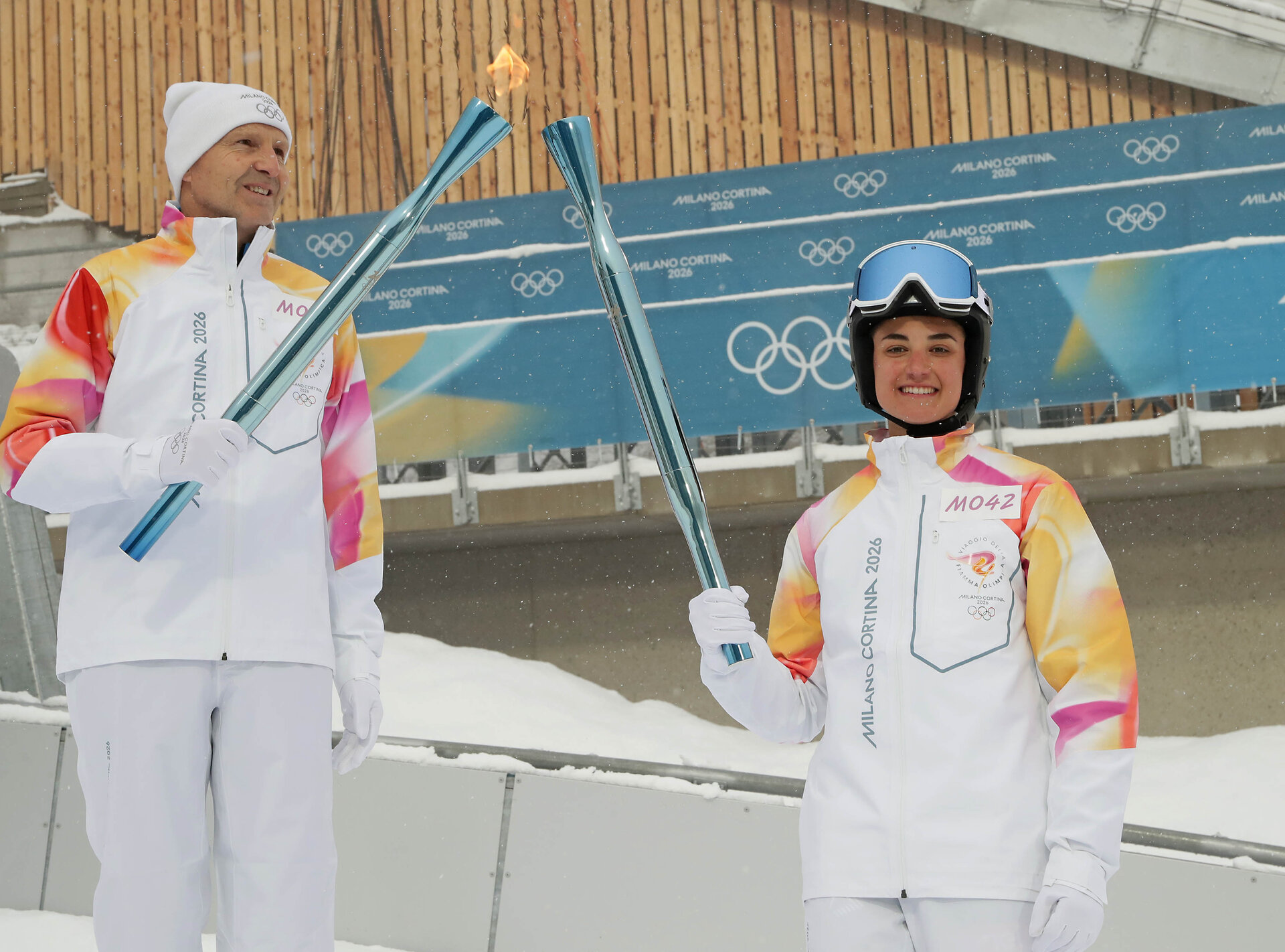Proprio presso lo Stadio del Salto Giuseppe Dal Ben di Predazzo c’è stato uno spettacolare passaggio di consegne della torcia: una staffetta è partita lungo la scalinata dell’in-run del trampolino HS 141 con gli ex combinatisti e saltatori Fabio Morandini e Virginio Lunardi che hanno effettuato il “Torch Kiss” con la combinatista Veronica Gianmoena, la quale ha percorso la discesa del trampolino HS 107 sugli sci e con la torcia Olimpica in mano. Speciale poi l’uscita dallo Stadio con la fiaccola portata dall’ex saltatore, particolarmente commosso, Matteo Antico, ora su una sedia a rotelle a causa di un incidente col parapendio.