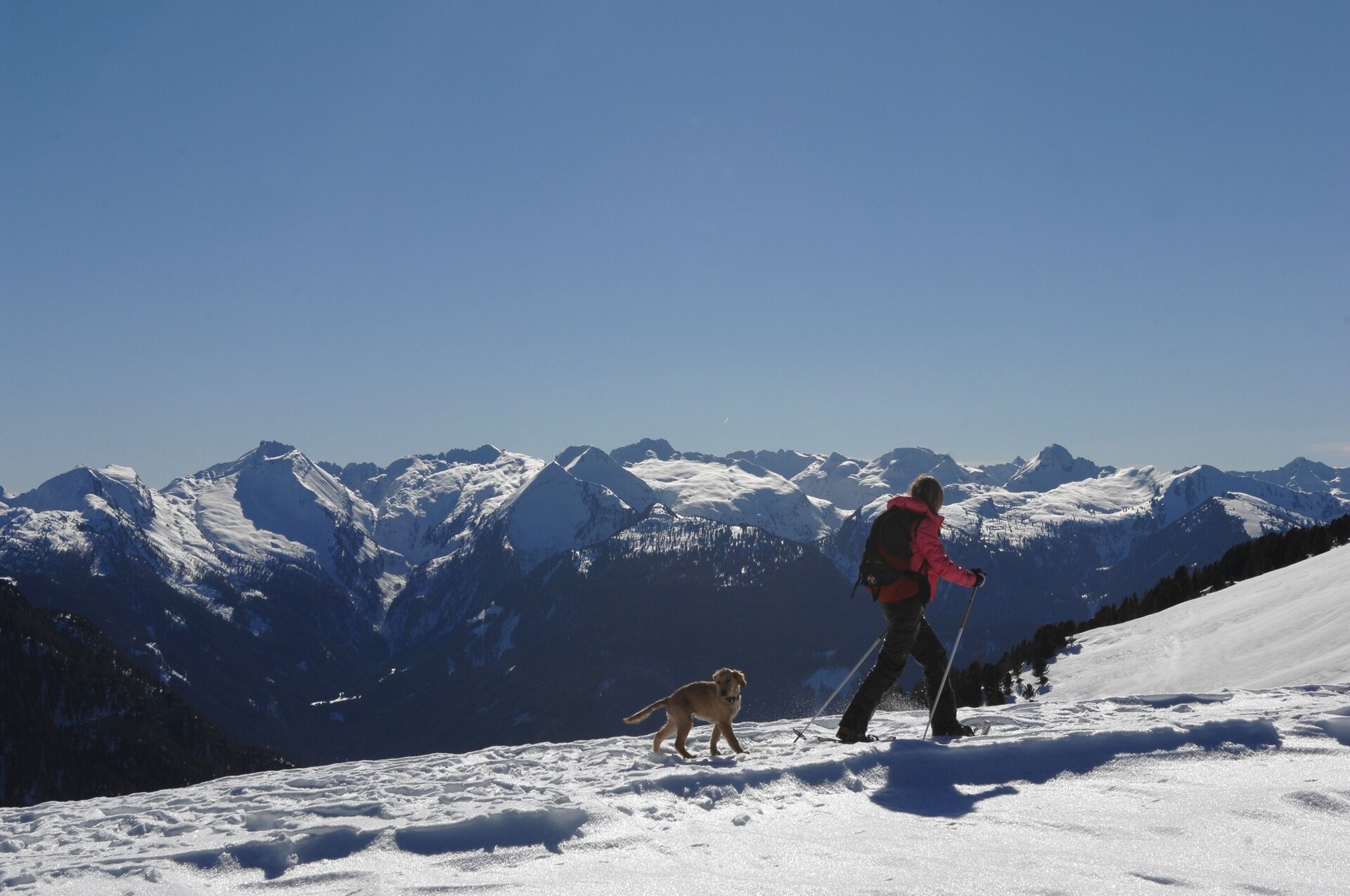 WAY UP From the top, on the right side (west) of the chairlift arrival (2180 m) a sign points the path which leads to La Porta and Baito della Bassa. With your snowshoes on, follow the big ridge, first descending slightly. Then, after a series of ups and downs, you will reach Baito della Bassa (2168 m). A short break at the hut allows you to admire the Pale di San Martino and the Lagorai chain. From here keep walking west, walking up to the small hill in front of you covered with mountain pines until the top of Dos dei Branchi (2274 m).