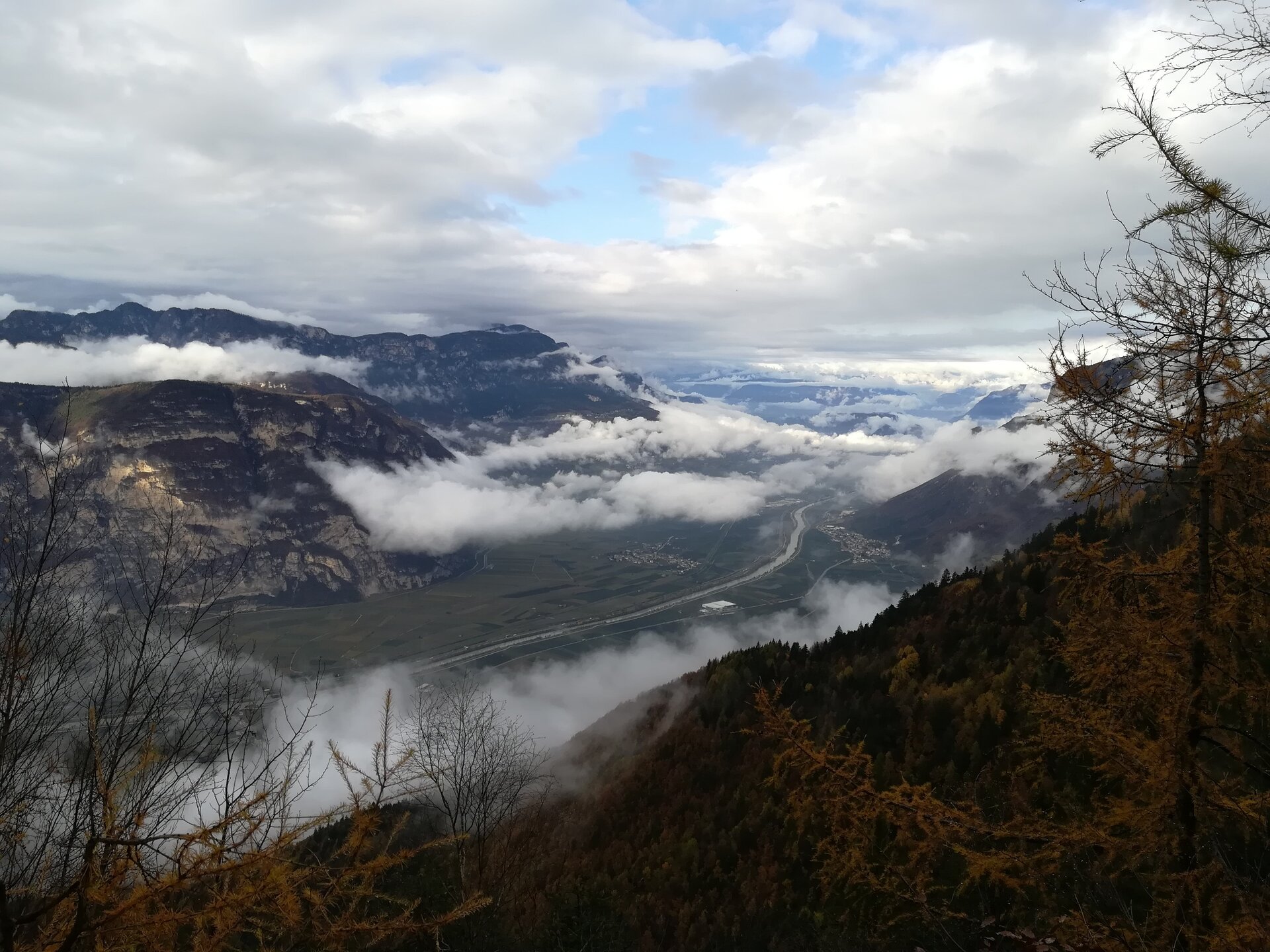 On the way back, the path runs along the cliff overlooking the Adige Valley, offering wide and unexpected views.