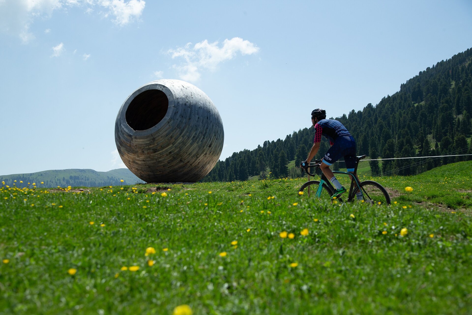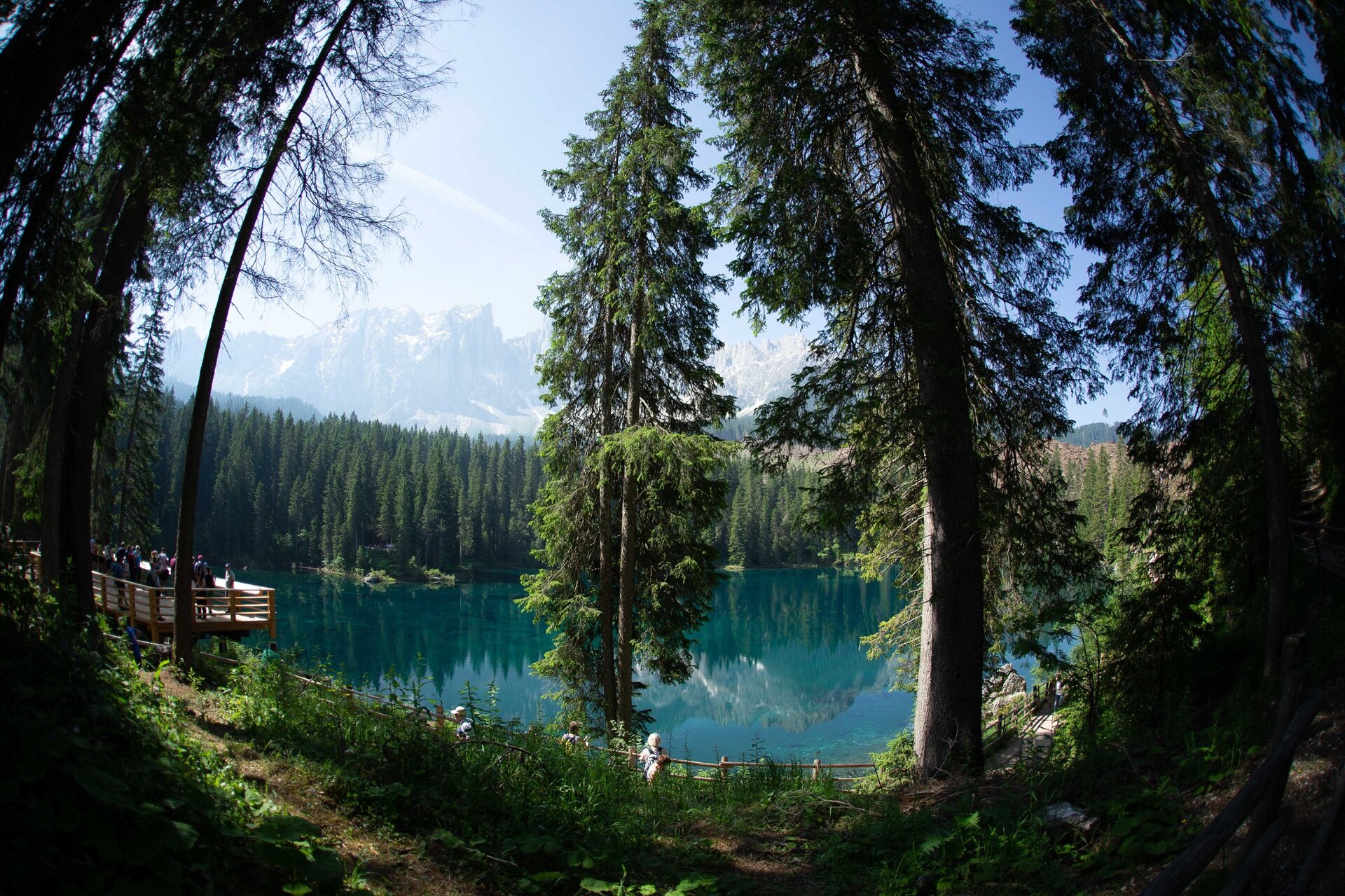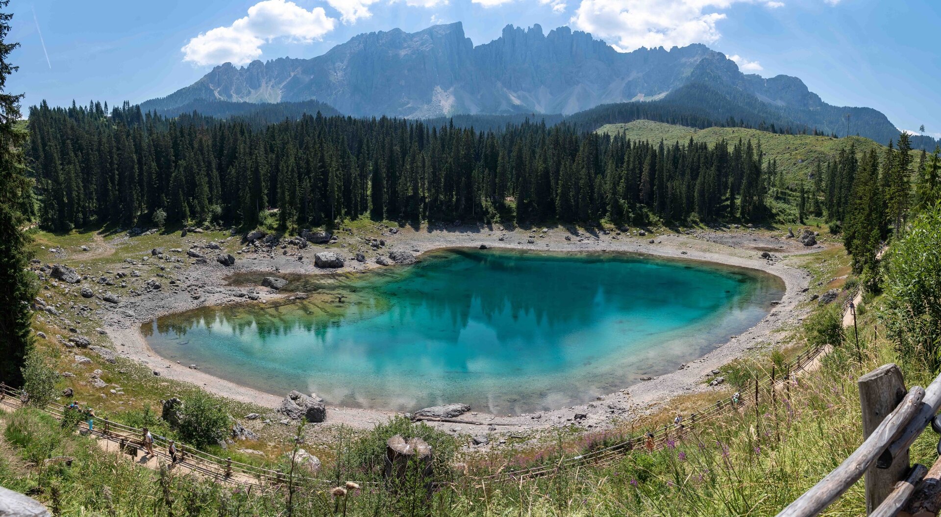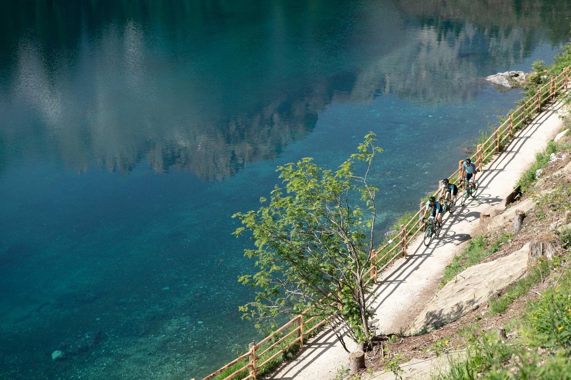A must, an icon, definitely one of the top 10 gravel routes in the Dolomites. Unmistakable landscapes follow one after another with every pedal stroke. The Dolomites of Latemar, Catinaccio, Sciliar, Corno Bianco, and the Pale di San Martino. The intense colors of Lake Carezza, a blue pearl embraced by the green of fir trees reflected in its calm waters.