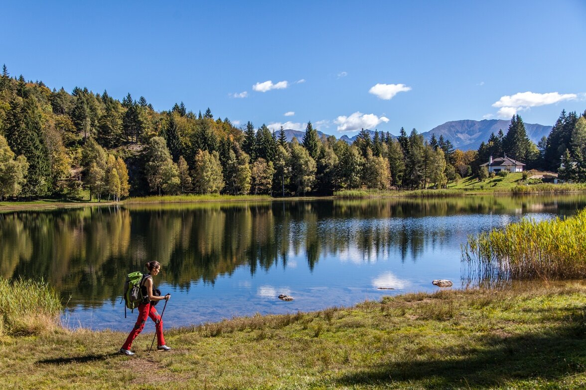 After a restorative stop at Rifugio Sauch, the route then follows: first a dirt road in the woods and then the SAT path E409 towards a forestry hut up to Zise, above the village of Ponciach (Faver). Here, take footpath SAT 415 (European footpath E5) to Vegiose and Val Fredata, before returning to Lago Santo, a splendid 1200-metre-high glacial origin lake set in a mixed spruce, birch and beech forest which is very northern European in feel. Its name is bound up with a legend. It is said that where the lake now stands the land was once bitterly fought over by heirs until one day, in desperation, one of these expressed the wish that it would turn into a lake. From that moment on the water levels started to rise. Worried about the danger hanging over them the people of Cembra set off to the area in pilgrimage and, when the parish priest threw the Virgin Mary's ring into the lake, the waters stopped rising.