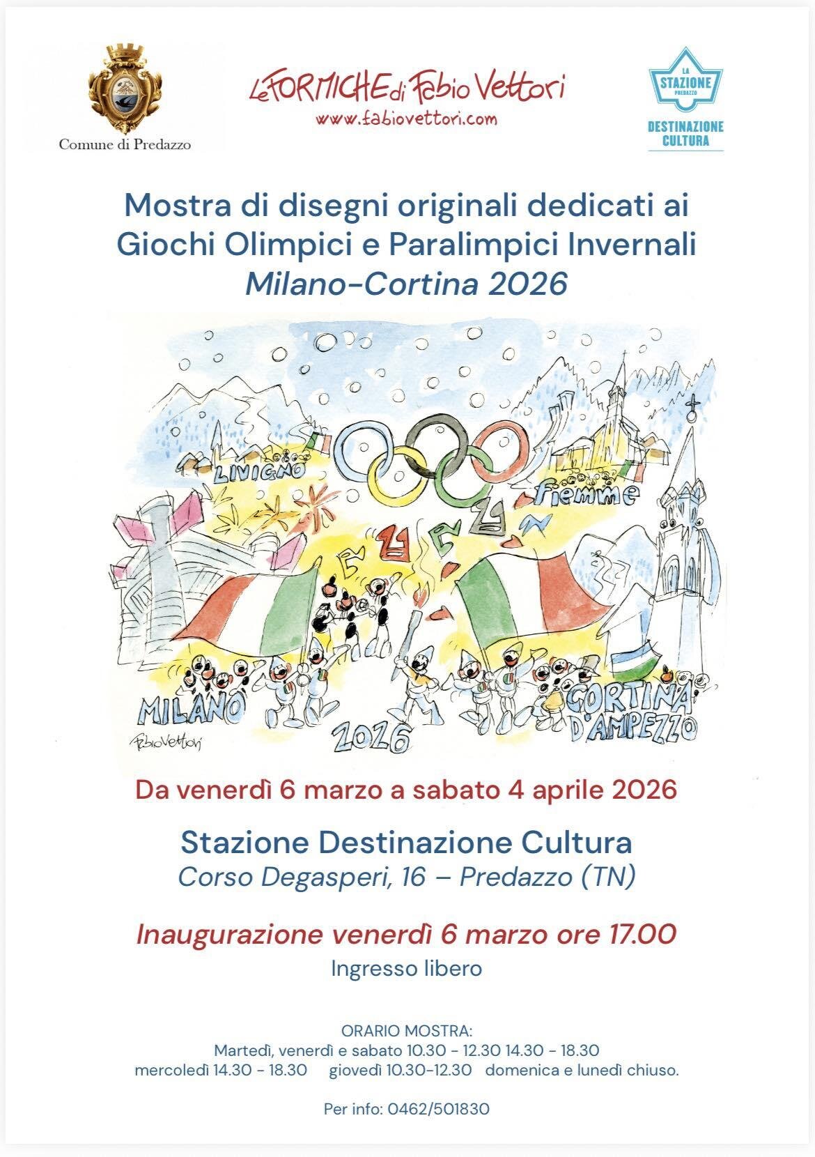 W godzinach otwarcia biblioteki będzie można odwiedzić wystawę oryginalnych rysunków poświęconych Igrzyskom Olimpijskim i Paraolimpijskim w górach w Mediolanie-Cortinie 2026 pod kuratelą Fabio Vettori. Wystawa będzie miała miejsce w LA STAZIONE/destinazione cultura do soboty 4 kwietnia. To jest wystawa, która będzie się rozwijać, ponieważ autor będzie zwiększał liczbę rysunków podczas okresu ekspozycji.